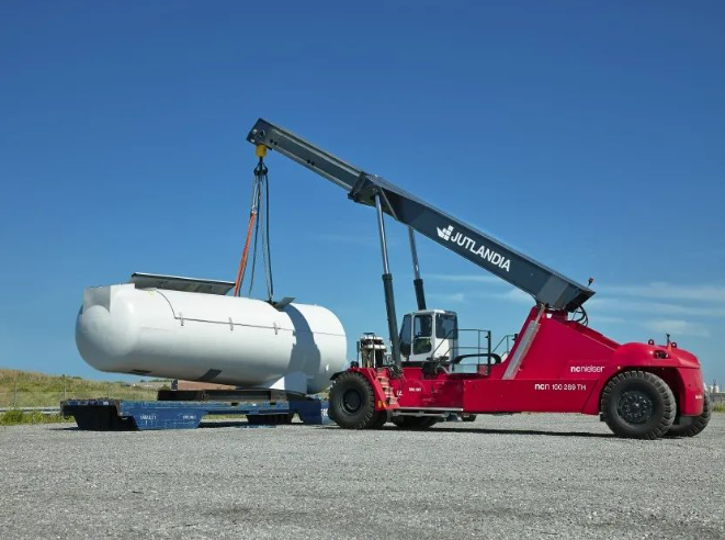 風電塔筒一節(jié)的重量在數(shù)十噸到上百噸不等。科尼正面吊配備起重機吊鉤,可將60-80噸的重物提升至15m高,而兩臺正面吊聯(lián)合作業(yè)可以處理120-160噸的龐大組件,可在小范圍內(nèi)實現(xiàn)靈活搬運。